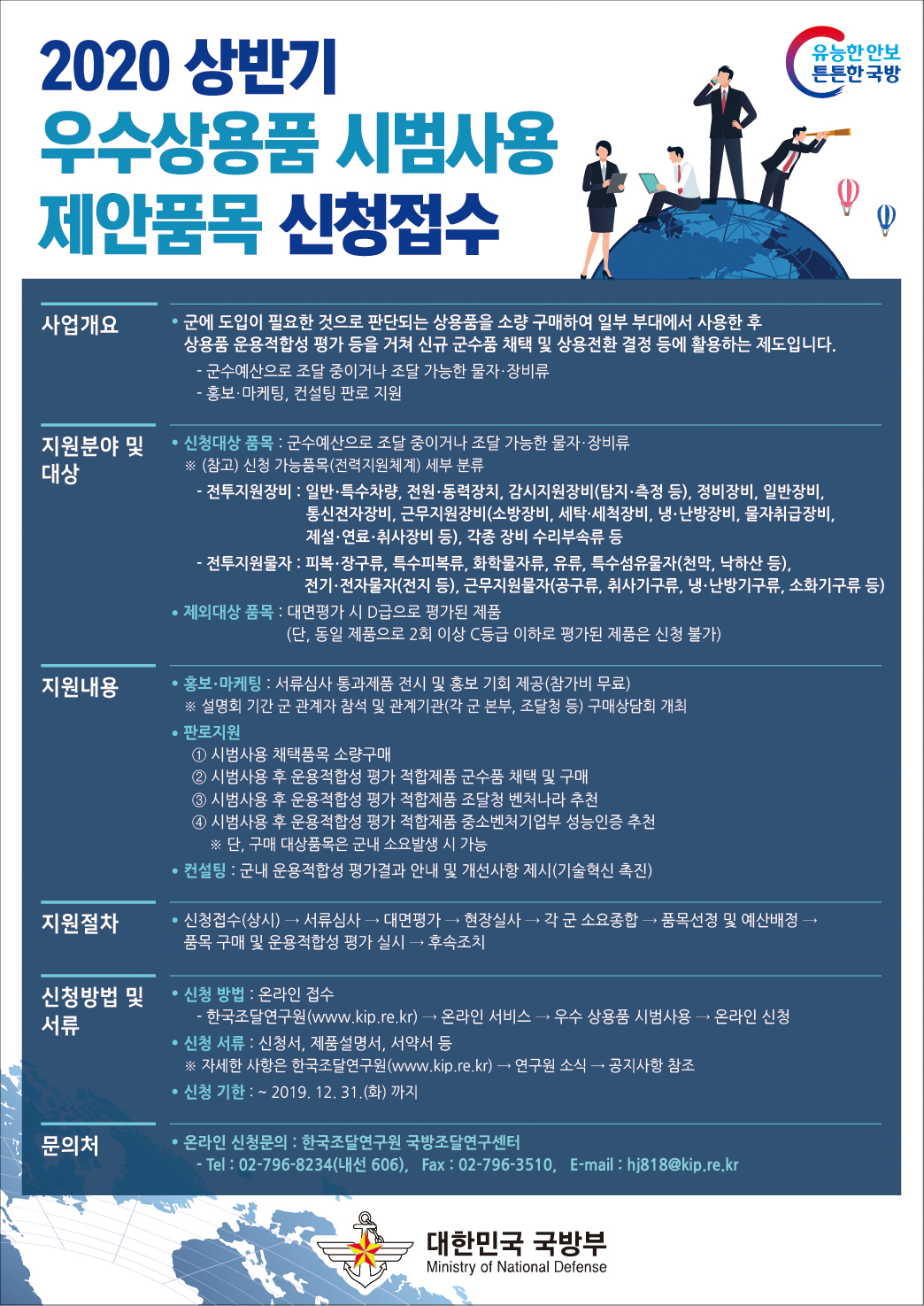 2020년 상반기 우수상용품 장비, 물자분야 시범사용 제안품목 신청 접수를 다음과 같이 안내하오니 많은 참여바랍니다.