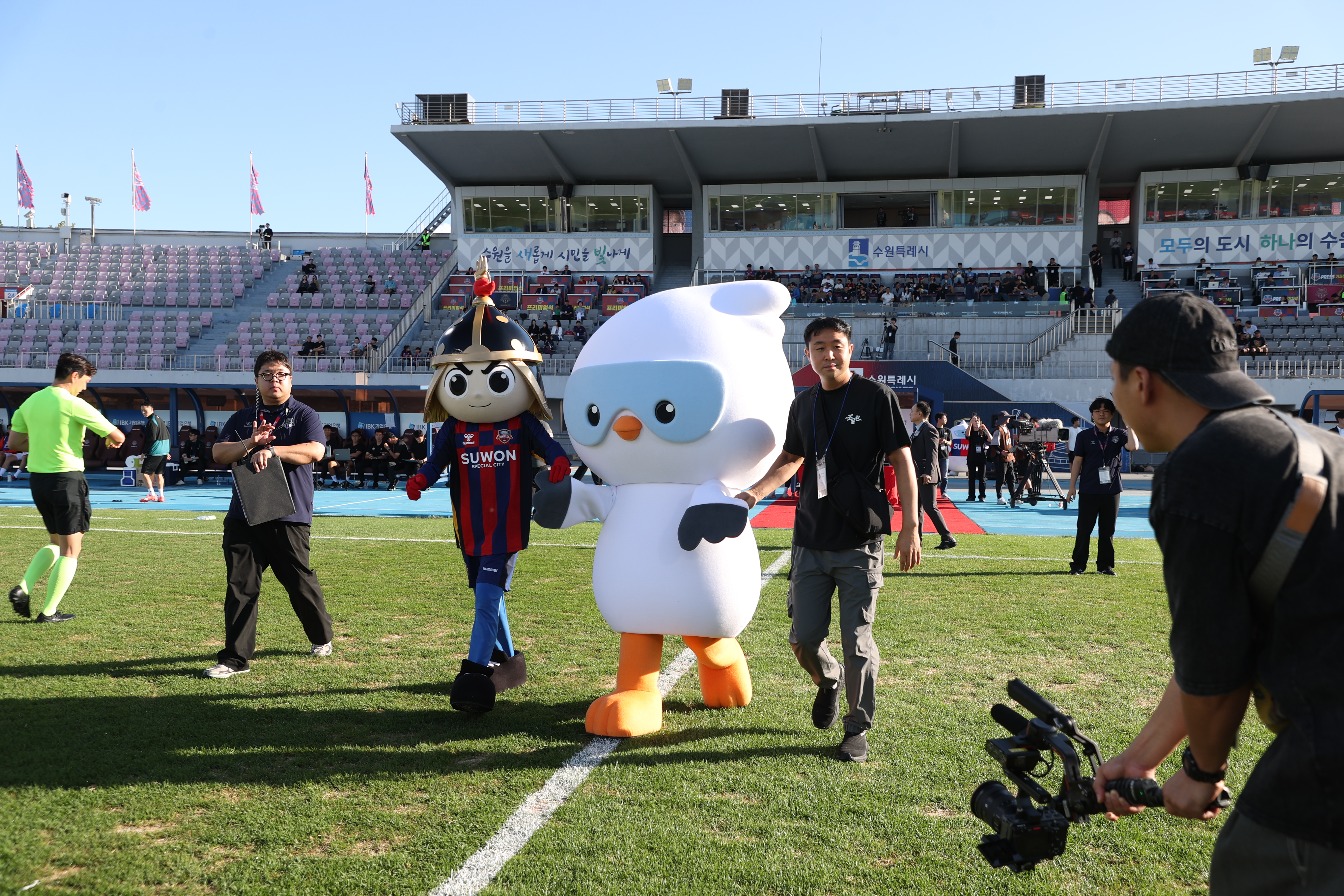 사진 1 : 정부 출범과 조달청 76주년을 맞아 진행한 '조달런 챌린지' 이벤트로 21일 K리그 수원FC의 홈경기에서 조달청 마스코트 '나르미'가 시축하기 위해 입장하고 있는 모습
