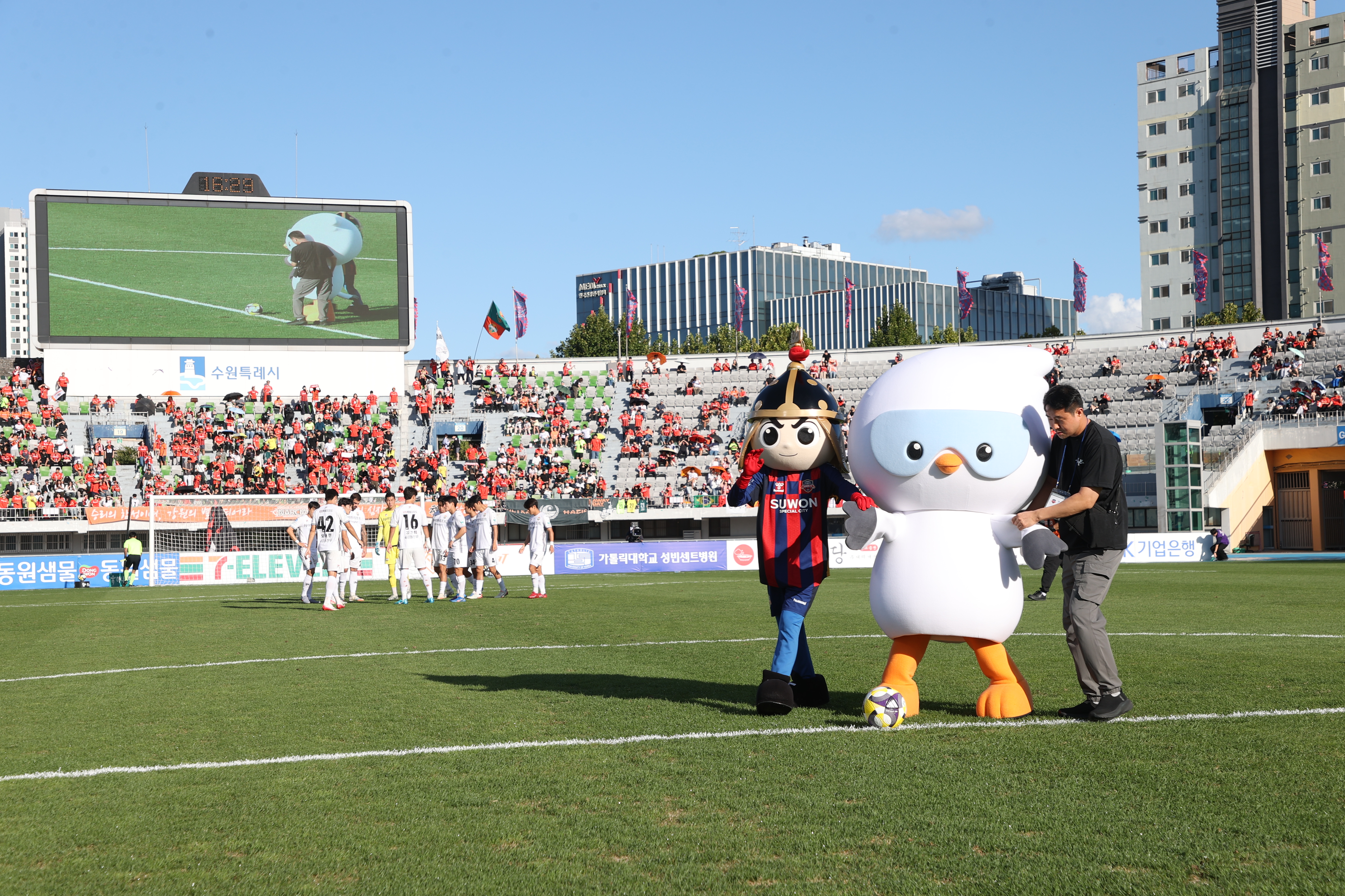 사진 2 : 정부 출범과 조달청 76주년을 맞아 진행한 '조달런 챌린지' 이벤트로 21일 수원종합경기장에서 있었던 수원FC와 강원FC의 K리그 경기에서 조달청 마스코트 '나르미'가 시축을 준비하고 있다.
