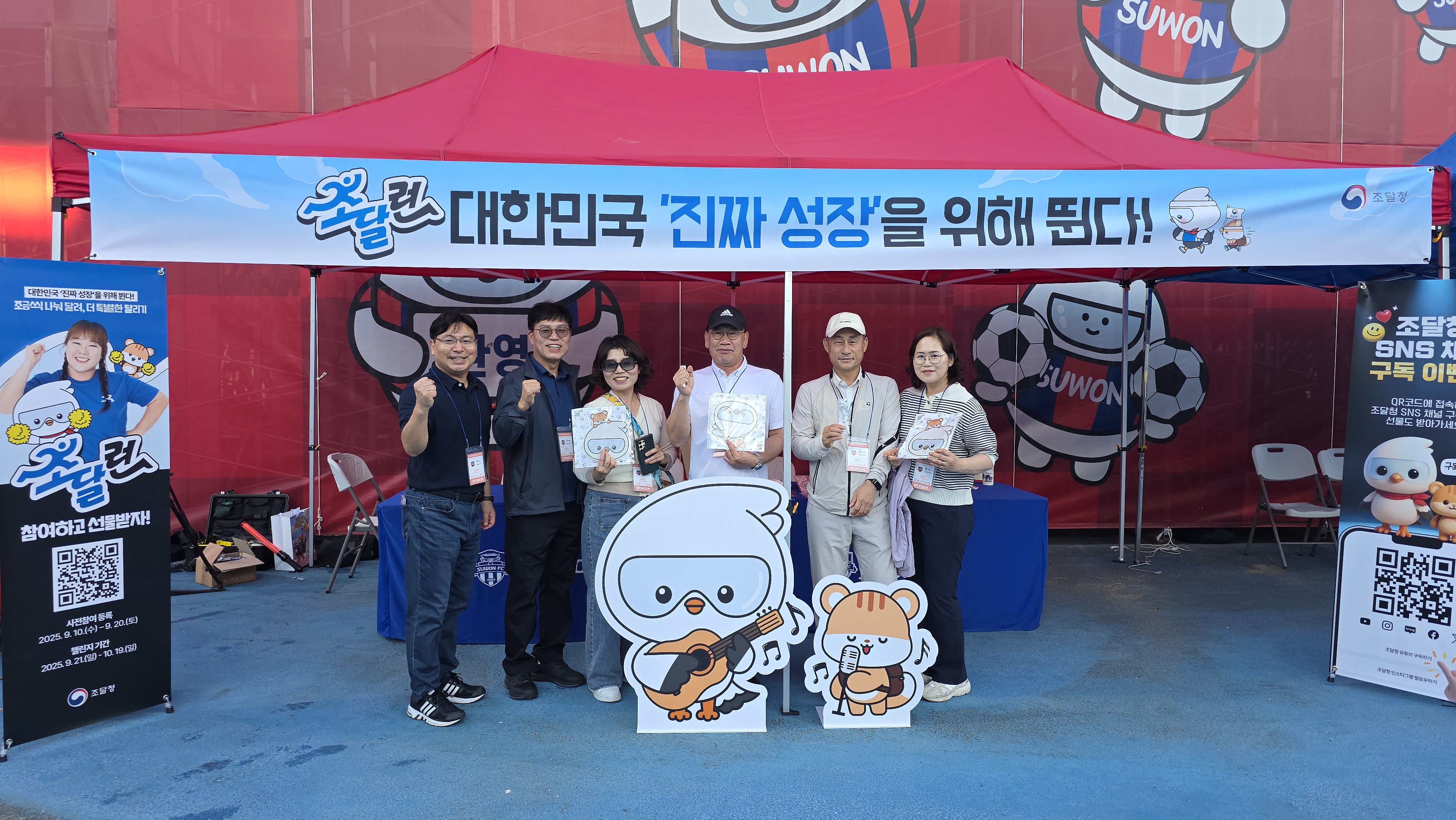 사진 3 : 임병철 서울지방조달청장(왼쪽에서 네 번째)이 21일 K리그 수원FC 홈경기의 사전행사로 마련된 부스에서 '조달런 마라톤 챌린지'를 홍보하고 있다.