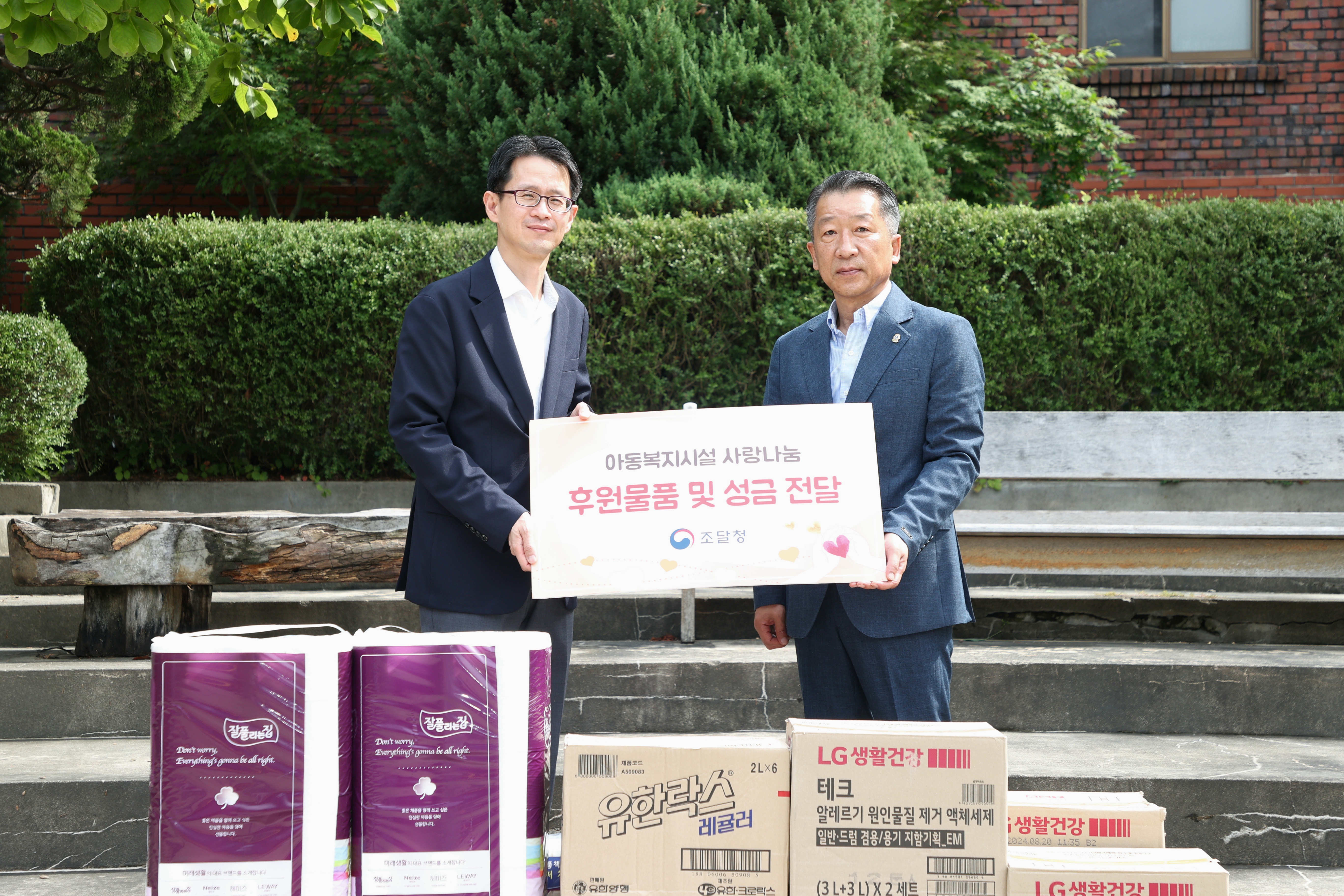사진 4 : 백승보 조달청장(왼쪽)은 26일 대전에 위치한 사회복지시설 정림원을 찾아 대전 태평시장에서 구입한 물품을 기부했다.