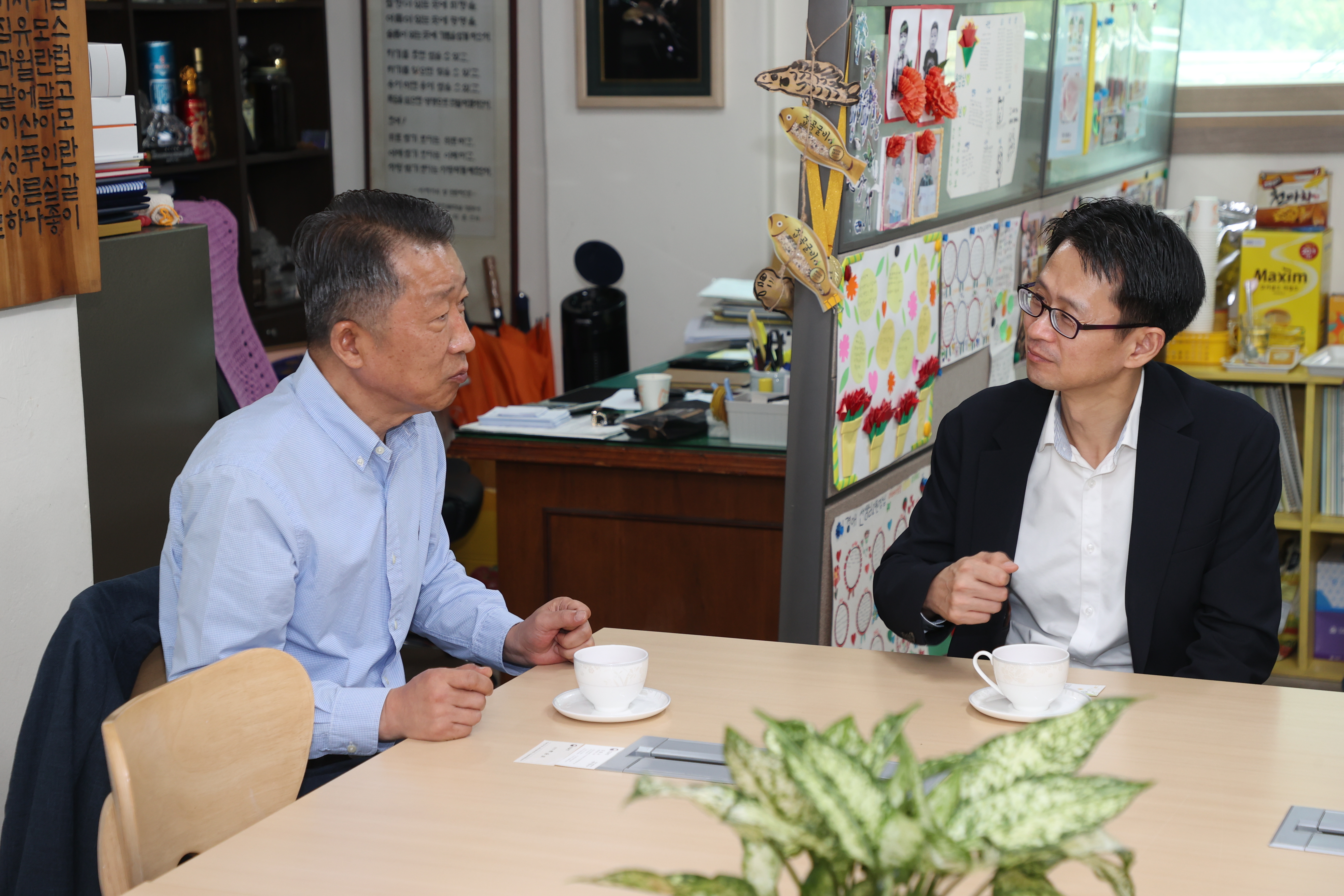 사진 5 : 백승보 조달청장(오른쪽)이 26일 대전 서구의 정림원을 위문하여 시설장과 이야기를 나누고 있다.