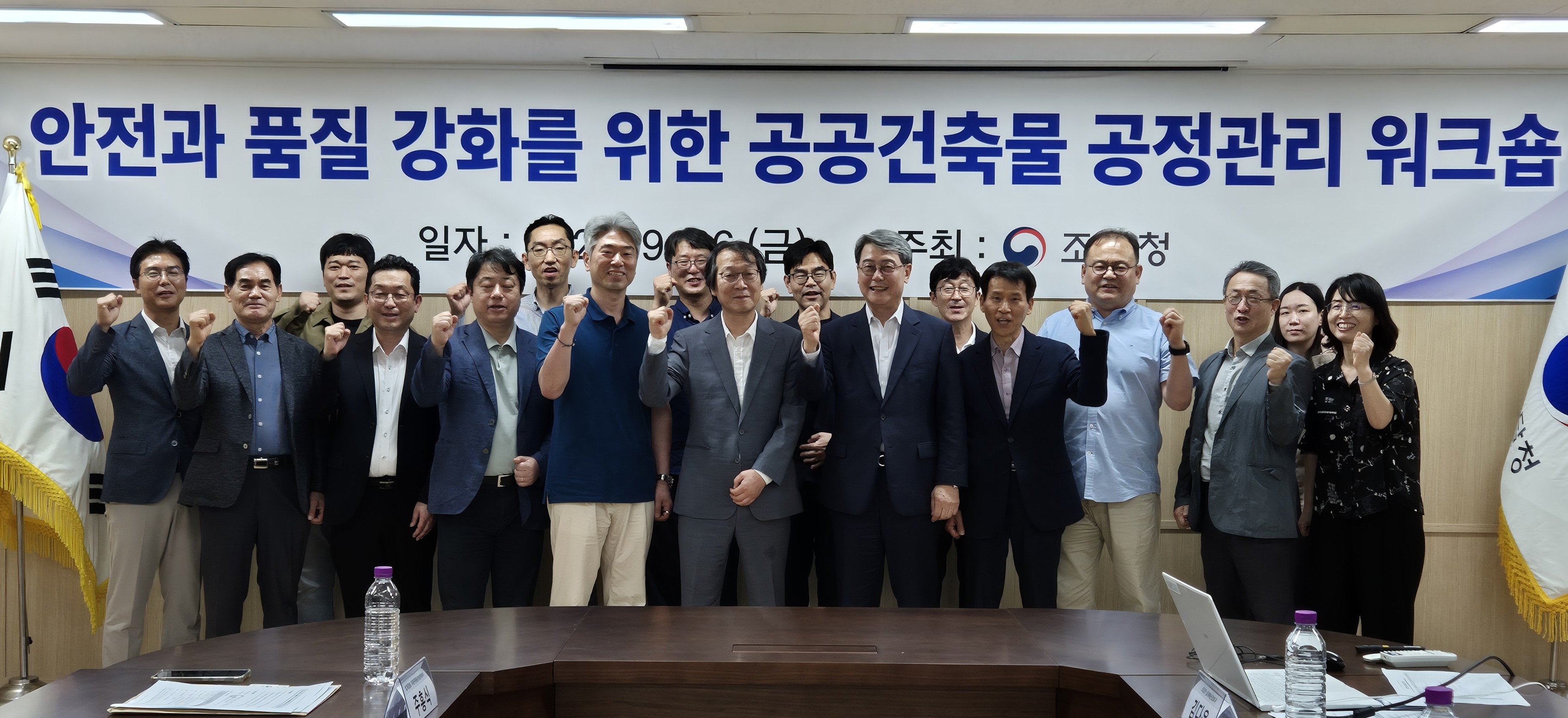 사진 1 : 권혁재 시설사업국장(앞줄 왼쪽에서 7번째)이 26일 서울지방조달청에서 '공공건축물 적정 공사기간 검토 기준마련'을 위한 워크숍에 참석하여 기념촬영을 하고 있다.
