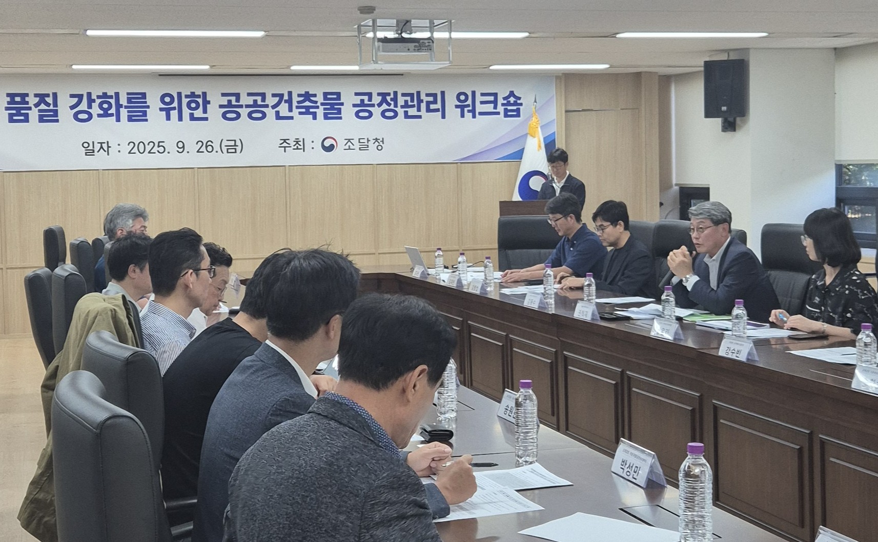 사진 2 : 권혁재 시설사업국장(오른쪽에서 2번째)이 26일 서울지방조달청에서 '공사기간 검토 기준마련' 워크숍에서 공사기관 확보 개선방향에 대한 토론을 하고있다.