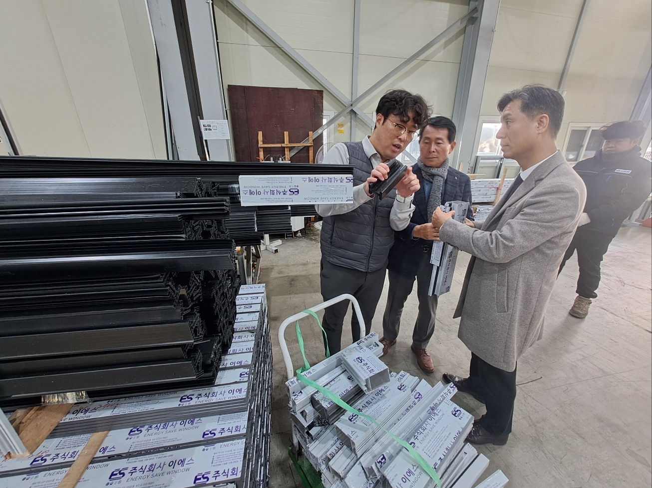 사진 1, 2 : 백호성 구매사업국장(오른쪽에서 두번째)이 9일 충북 청주시 소재 금속제창호 제조기업인 (주)이에스창호(대표 신창수)를 방문하여 현장점검을 실시하고 있다.