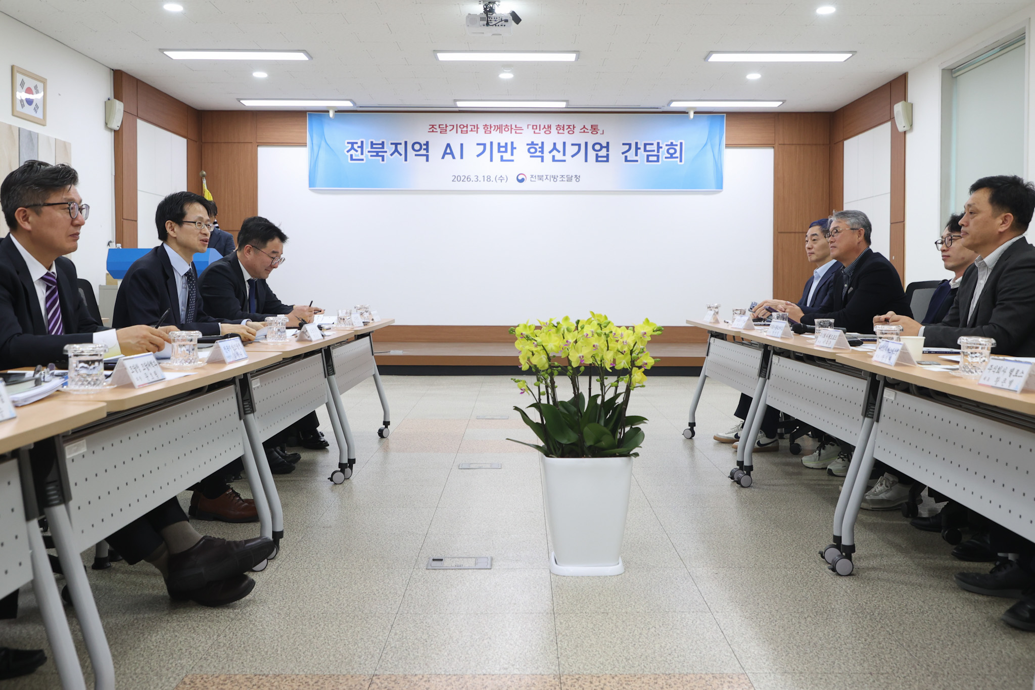 사진 1 : 백승보 조달청장(왼쪽에서 두번째)이 18일 전북지역 AI 기반 혁신기업과의 간담회에서 현장의 목소리를 청취 했다.