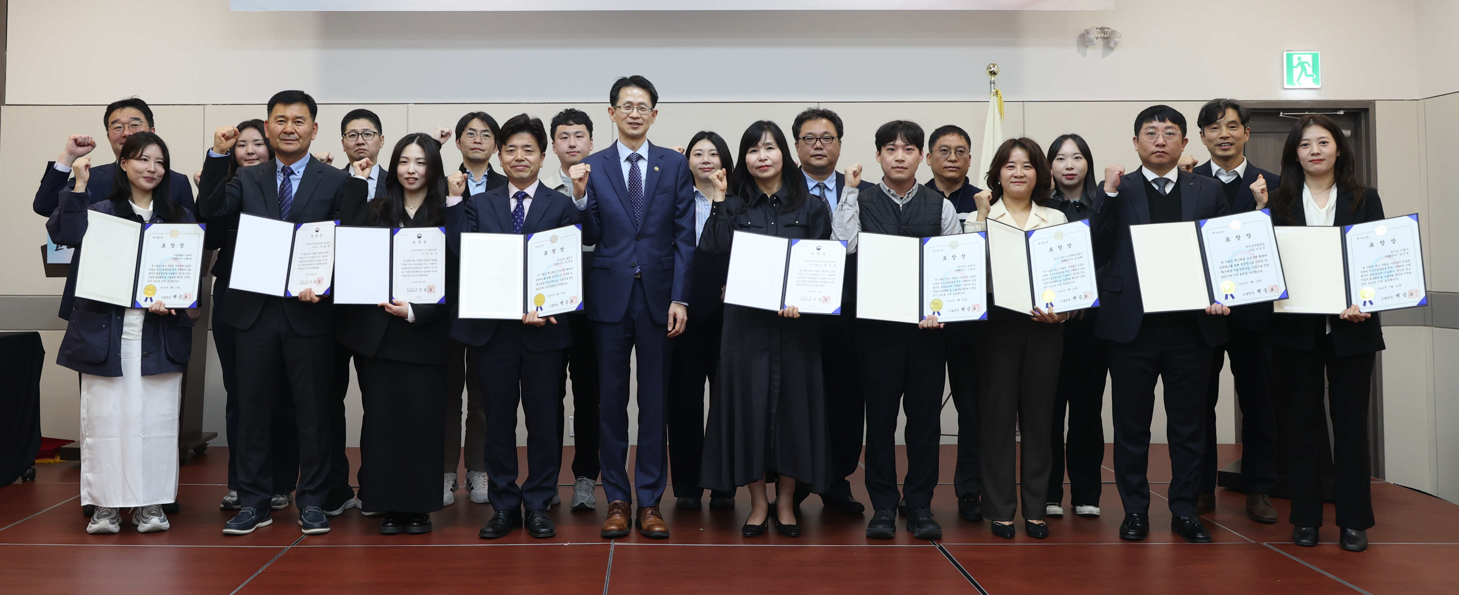 사진 2 : 백승보 조달청장(앞줄 왼쪽 다섯번째)이 26일 경기도 고양시 킨텍스에서 열린 '우수조달물품 및 혁신제품 구매 우수기관 유공자 시상식'에서 유공직원에게 표창장을 수여한 뒤 기념촬영을 하고있다.