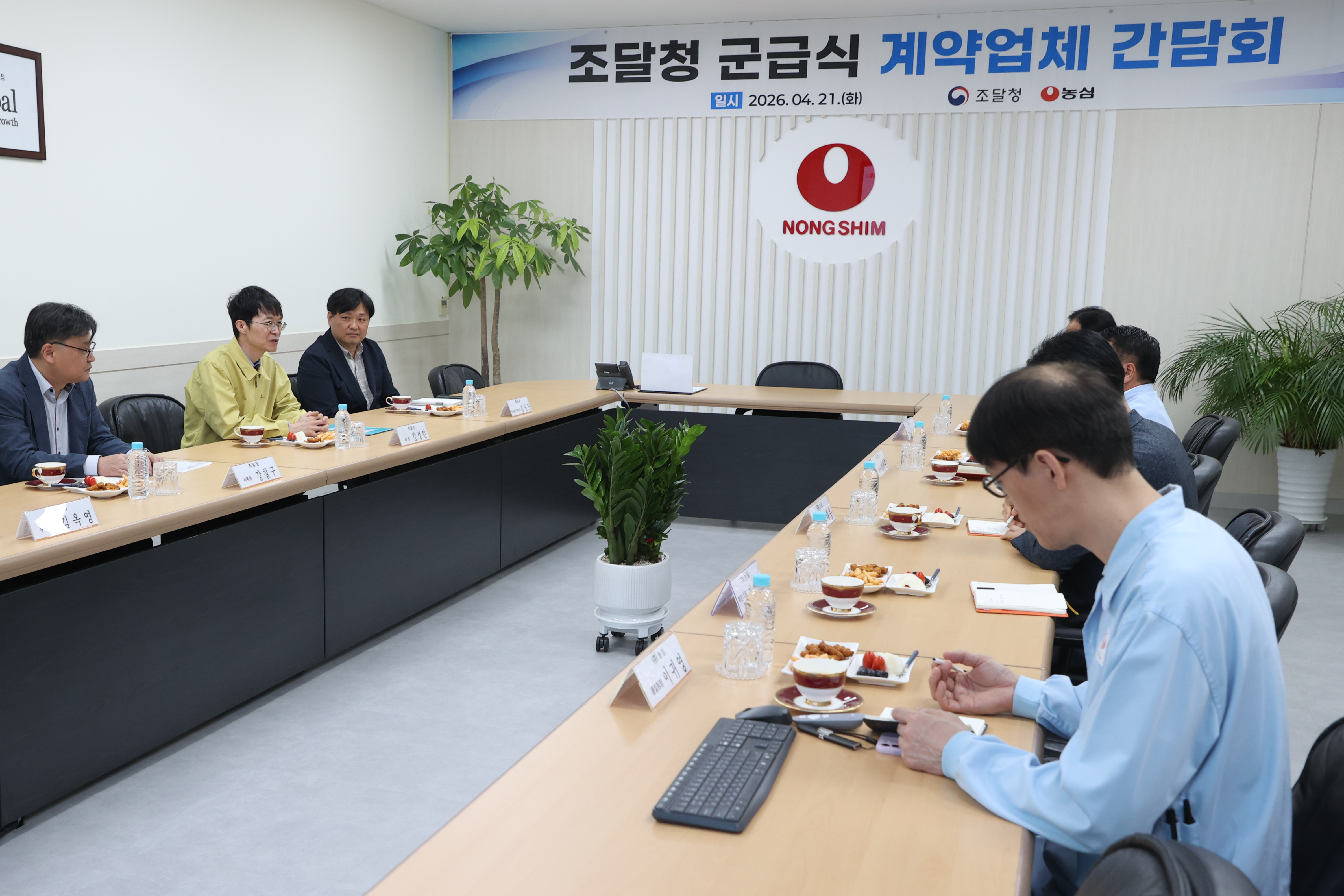 사진 2 : 강성민 조달청 차장(왼쪽에서 두번째)이 21일 군납 식품 제조기업인 (주)농심의 경상북도 구미 공장을 방문해 현장 관계자들의 목소리를 청취하고 있다.
