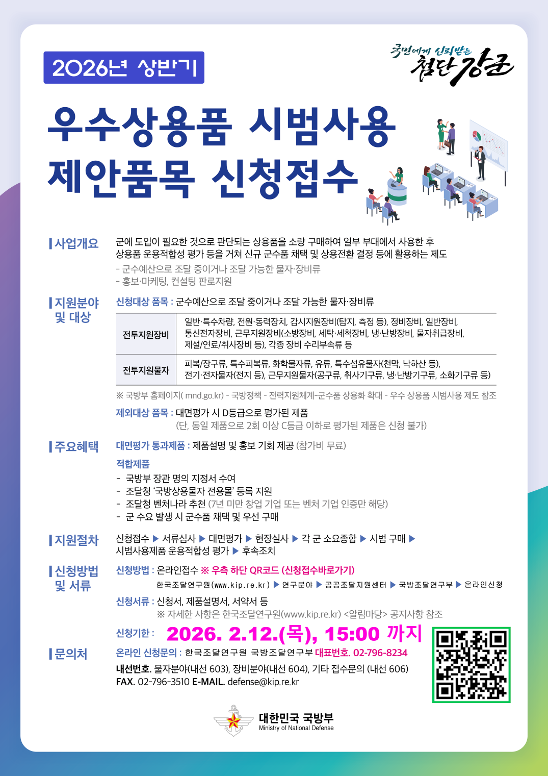 2026년 상반기 우수 상용품 시범사용 제안품목 신청 접수를 다음과 같이 안내하오니 많은 참여바랍니다.