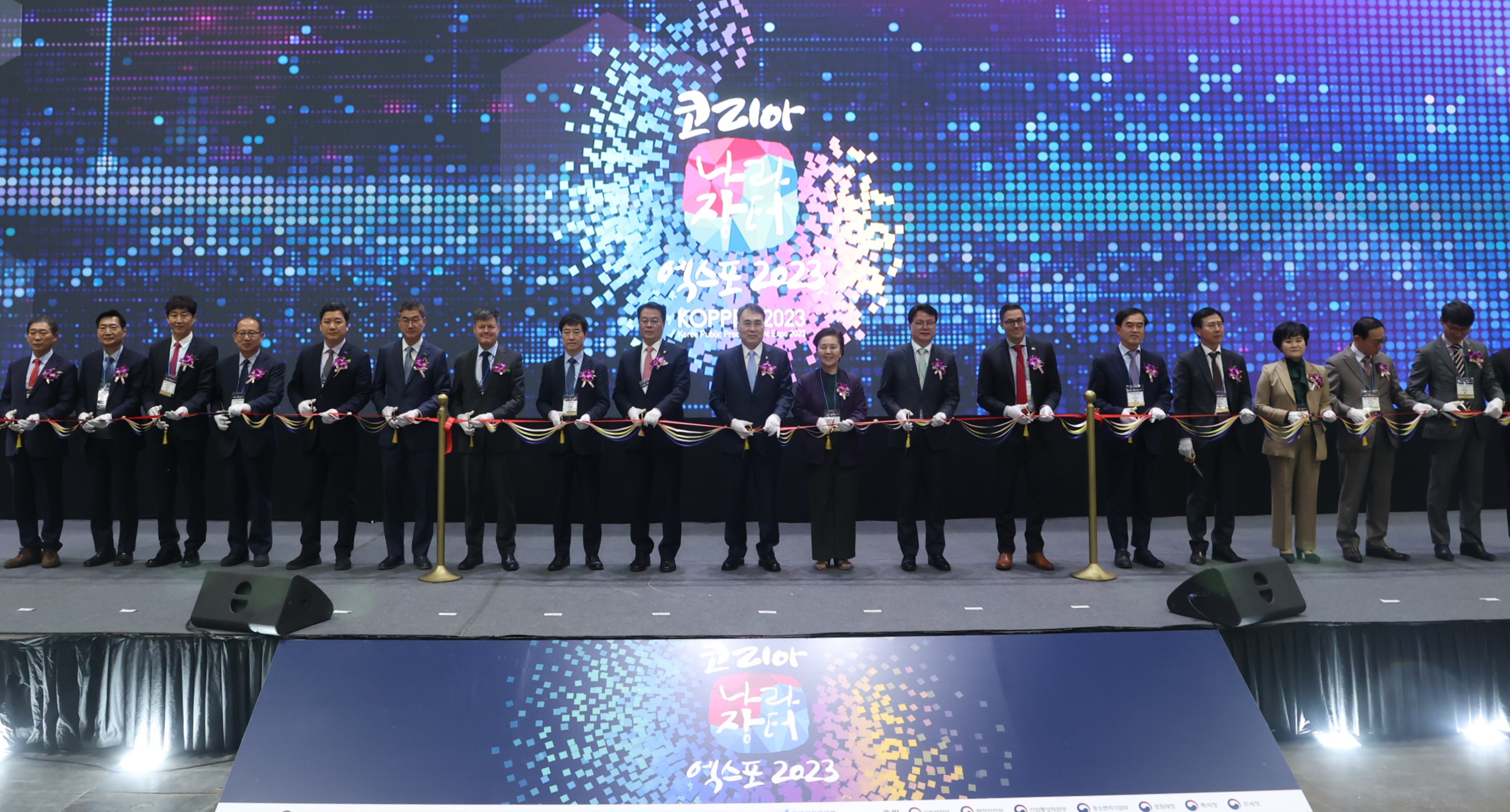사진 1 : 이종욱 조달청장(사진 왼쪽부터 열번째)이 26일 열린 코리아 나라장터 엑스포 2023 개막식에서 테이프 커팅을 하고 있다.