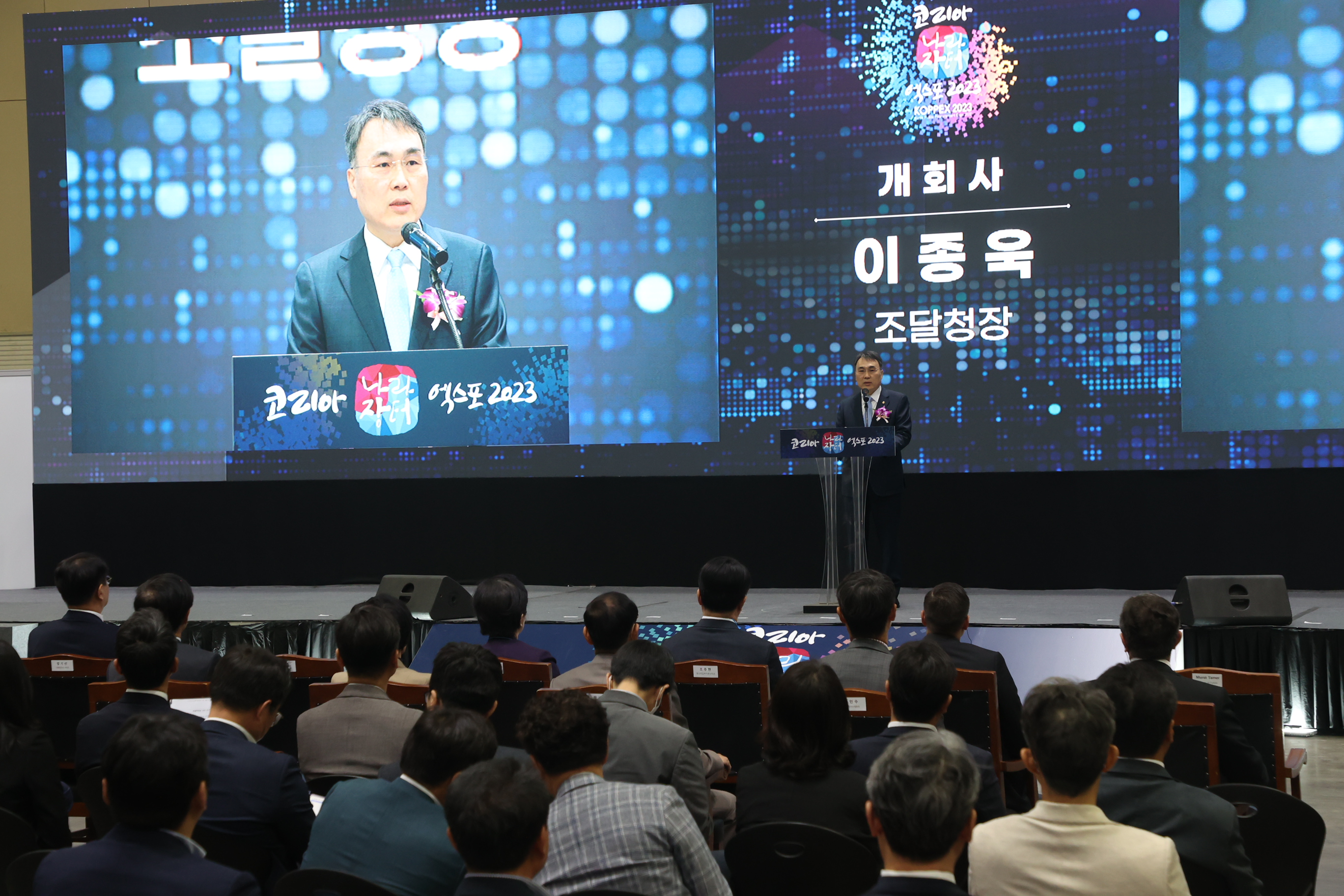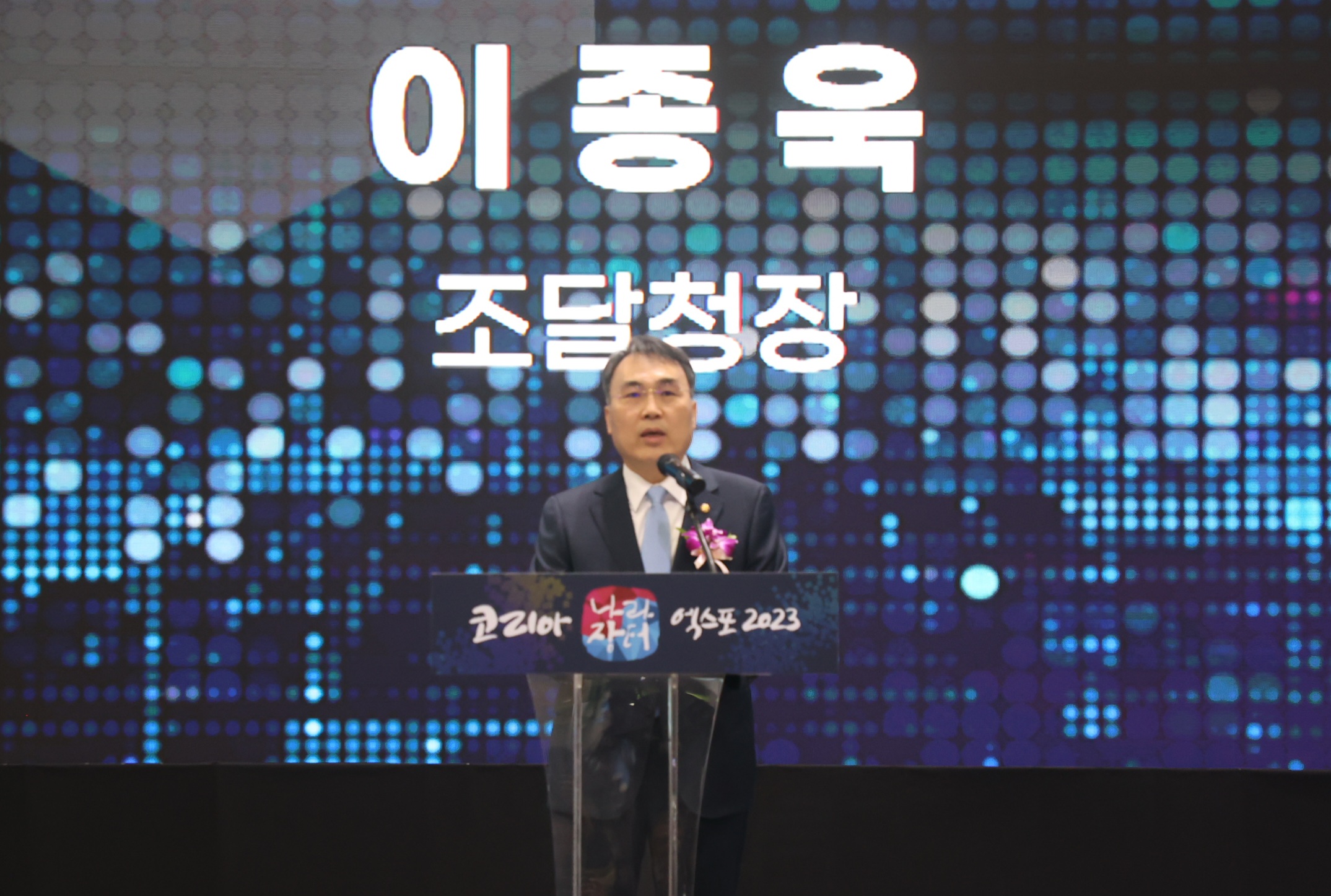 사진 2, 3, 4 : 이종욱 조달청장(사진 가운데)이 26일 열린 코리아 나라장터 엑스포 2023 개막식에서 개회사를 하고 있다.