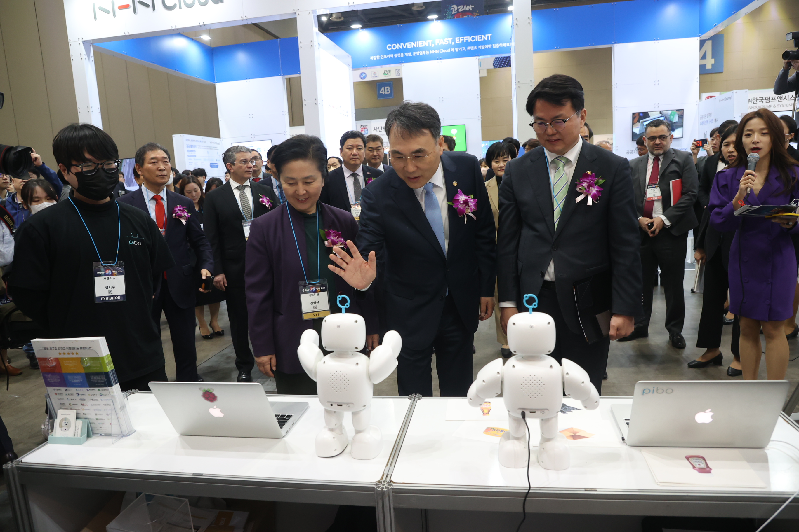 사진 5 : 이종욱 조달청장(사진 오른쪽부터 두번째)이 26일 열린 코리아 나라장터 엑스포 2023에서 인공지능 관련 혁신제품을 시연해보고 있다.