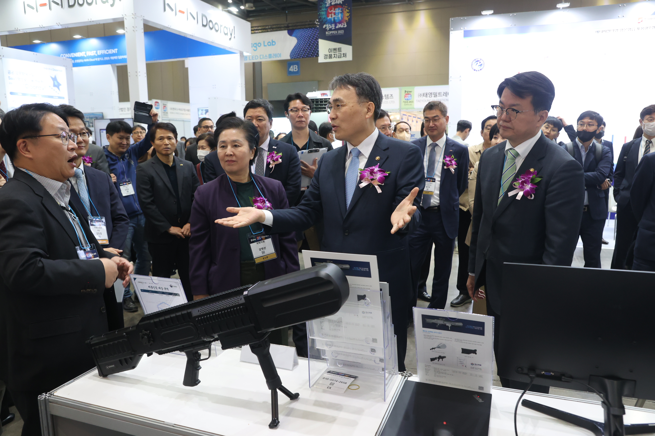 사진 6 : 이종욱 조달청장(사진 오른쪽부터 두번째)과 김영선 국회의원(사진 오른쪽부터 세번째)이 26일 열린 코리아 나라장터 엑스포 2023에서 배터리 일체형 안티드론건에 대해 설명을 듣고 있다.