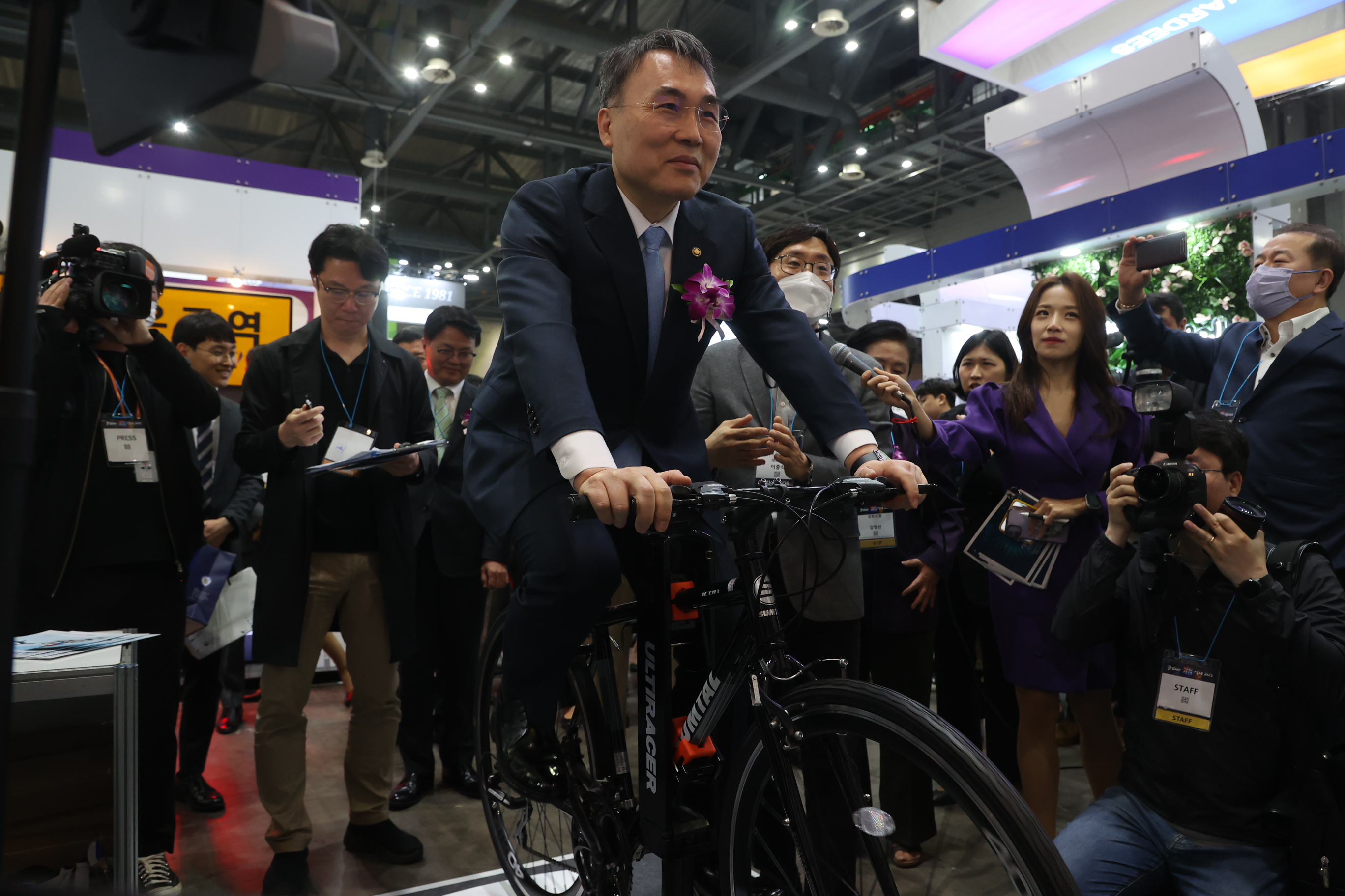 사진 7 : 이종욱 조달청장(사진 가운데)이 26일 열린 코리아 나라장터 엑스포 2023에서 혁신제품 밸런스 트레이닝 사이클링 시스템을 직접 시연해보고 있다.