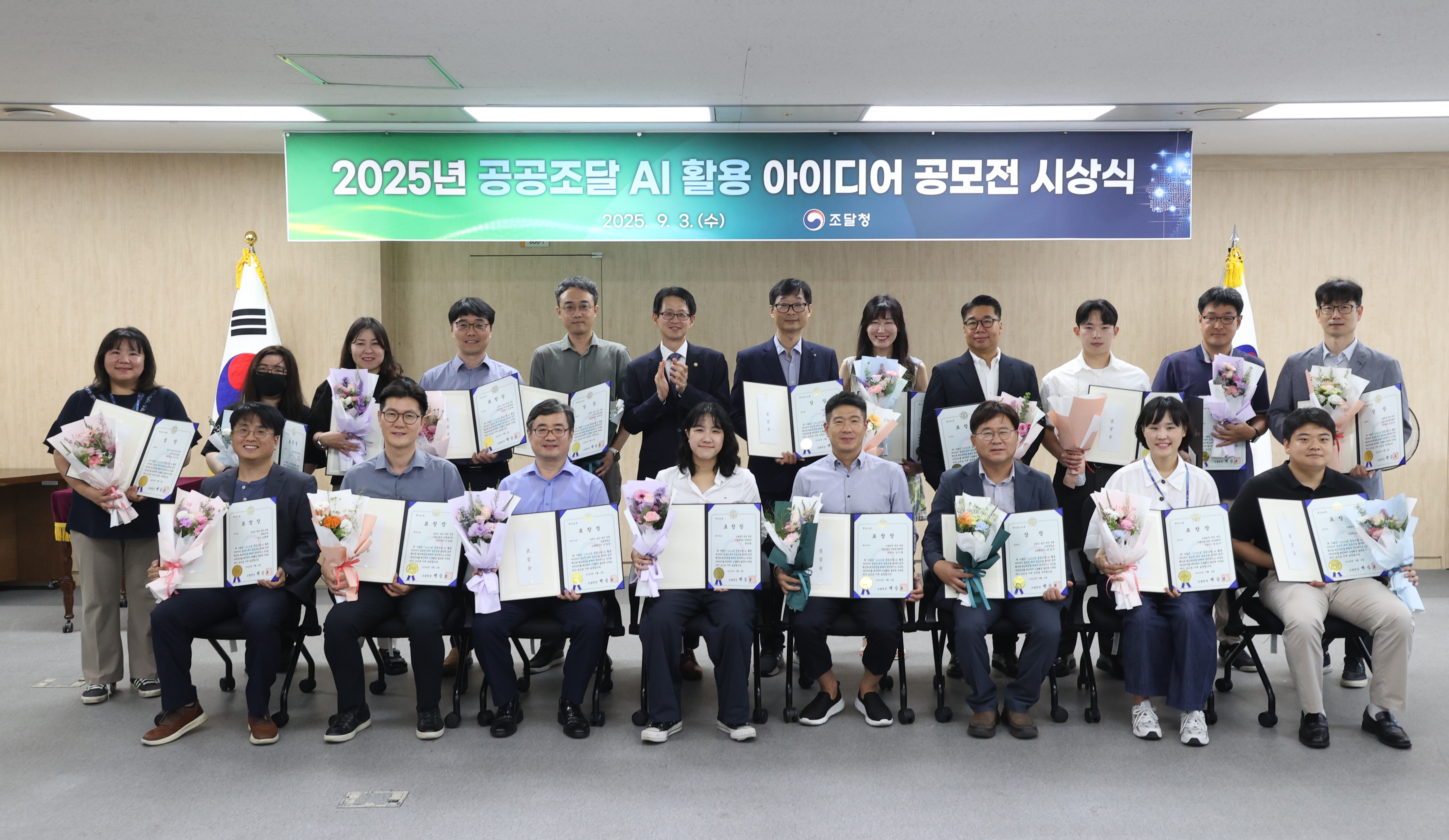 사진 1 : 백승보 조달청장(뒷줄 왼쪽에서 여섯 번째)이 3일 조달청에서 열린 '2025년 공공조달 AI 활용 아이디어 공모전 시상식'에서 수상자들과 함께 기념촬영을 하고 있다.