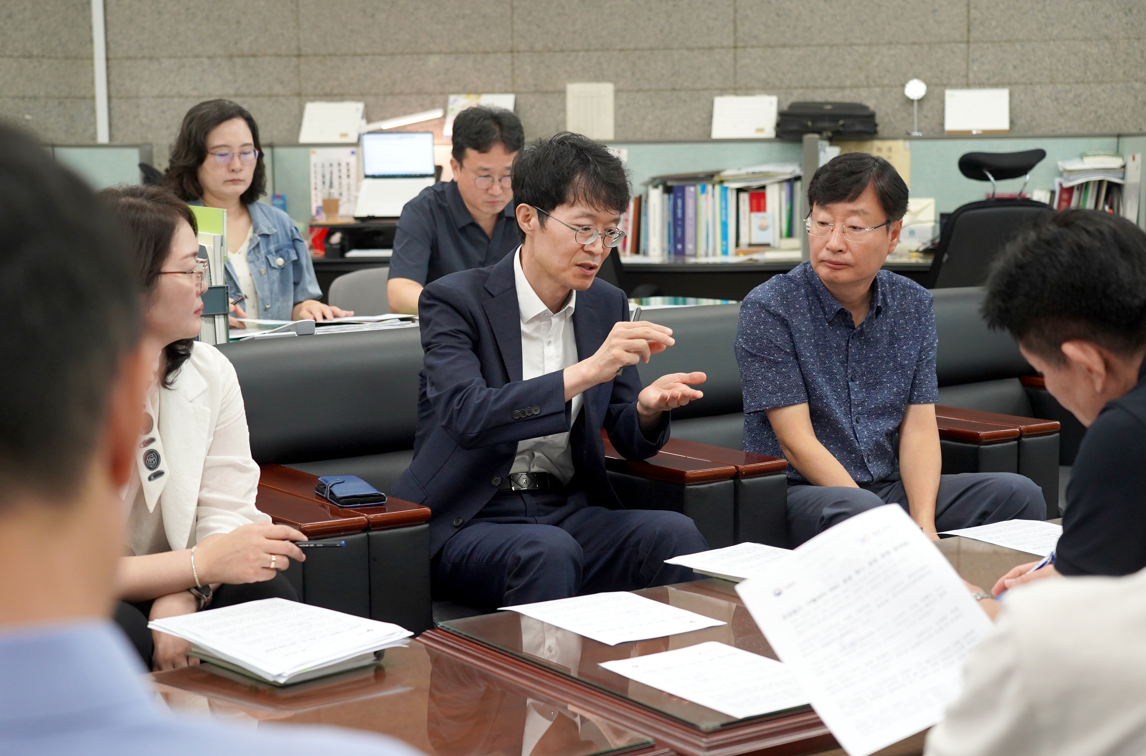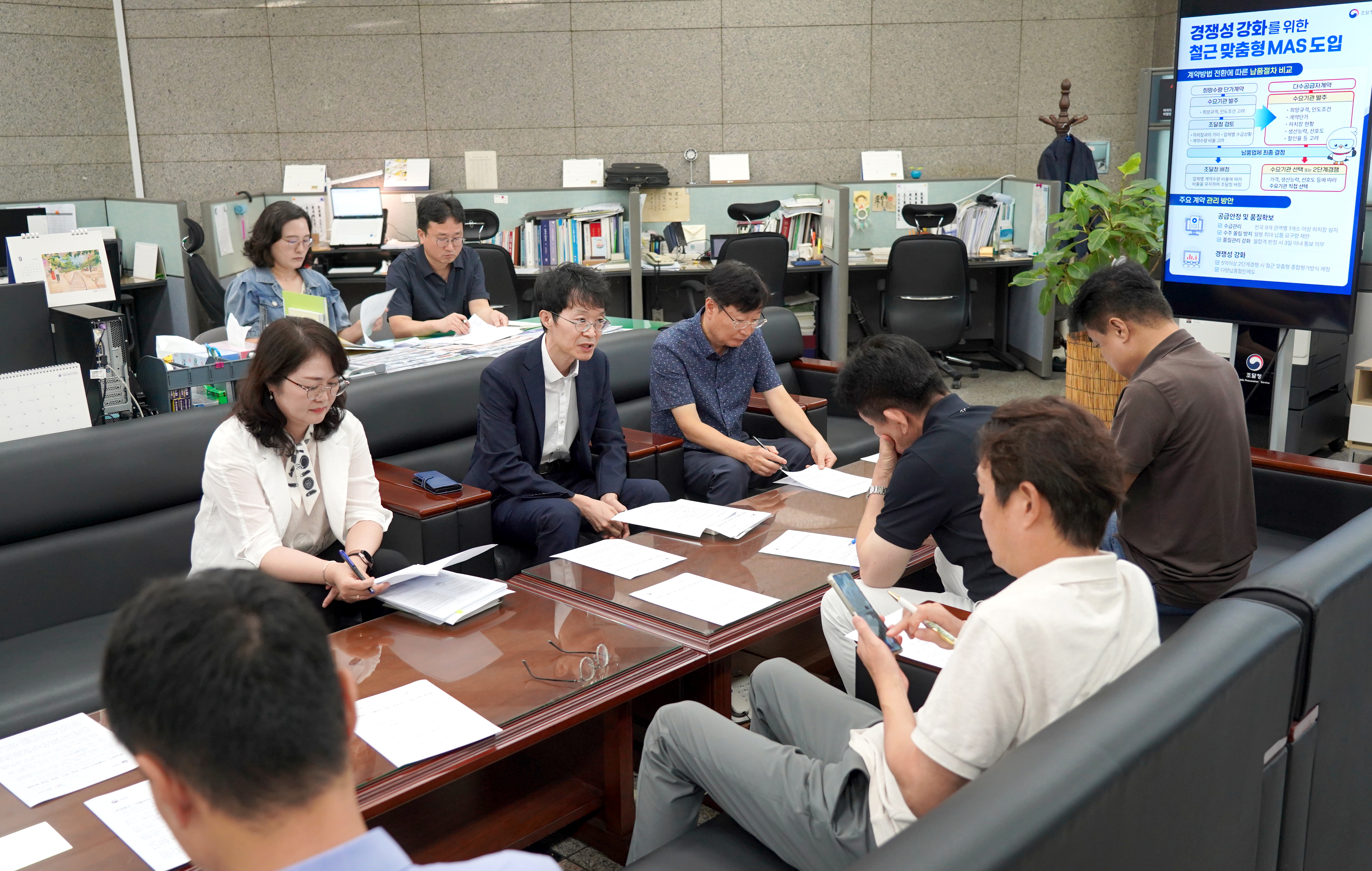 사진 : 강성민 구매사업국장(왼쪽에서 두 번째)이 16일 정부대전청사 기자실에서 '관급 철근의 다수공급자계약(MAS) 방식 전환'과 관련하여 브리핑하고 있다.