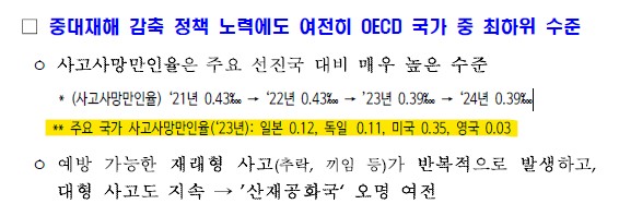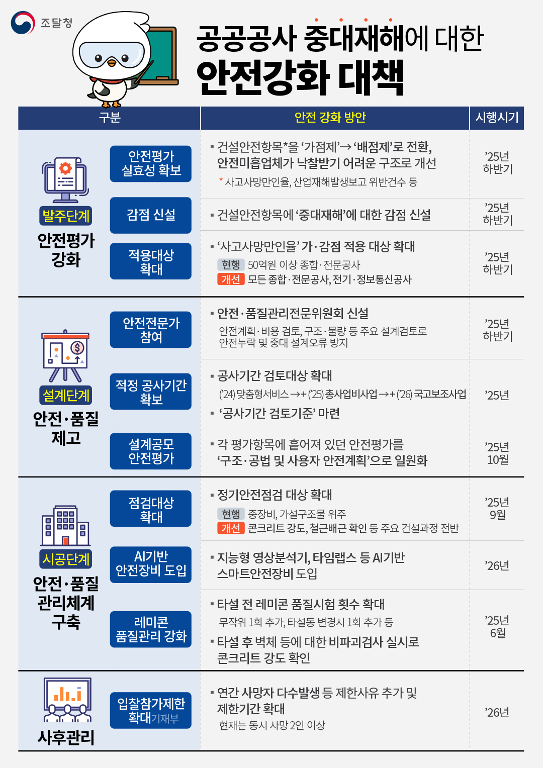 250918_(보도자료)_건설현장_중대재해_감축_위한_건설안전_혁신_본격화_배포용.hwp 인포그래픽_공공공사_안전강화_최종.jpg 사진1_공공공사_중대재해_안전대책_브리핑.JPG 사진2_공공공사_중대재해_안전대책_브리핑.JPG 사진3_공공공사_중대재해_안전대책_브리핑.JPG (참고자료)_해외_주요_국가_사고사망만인율.jpg |