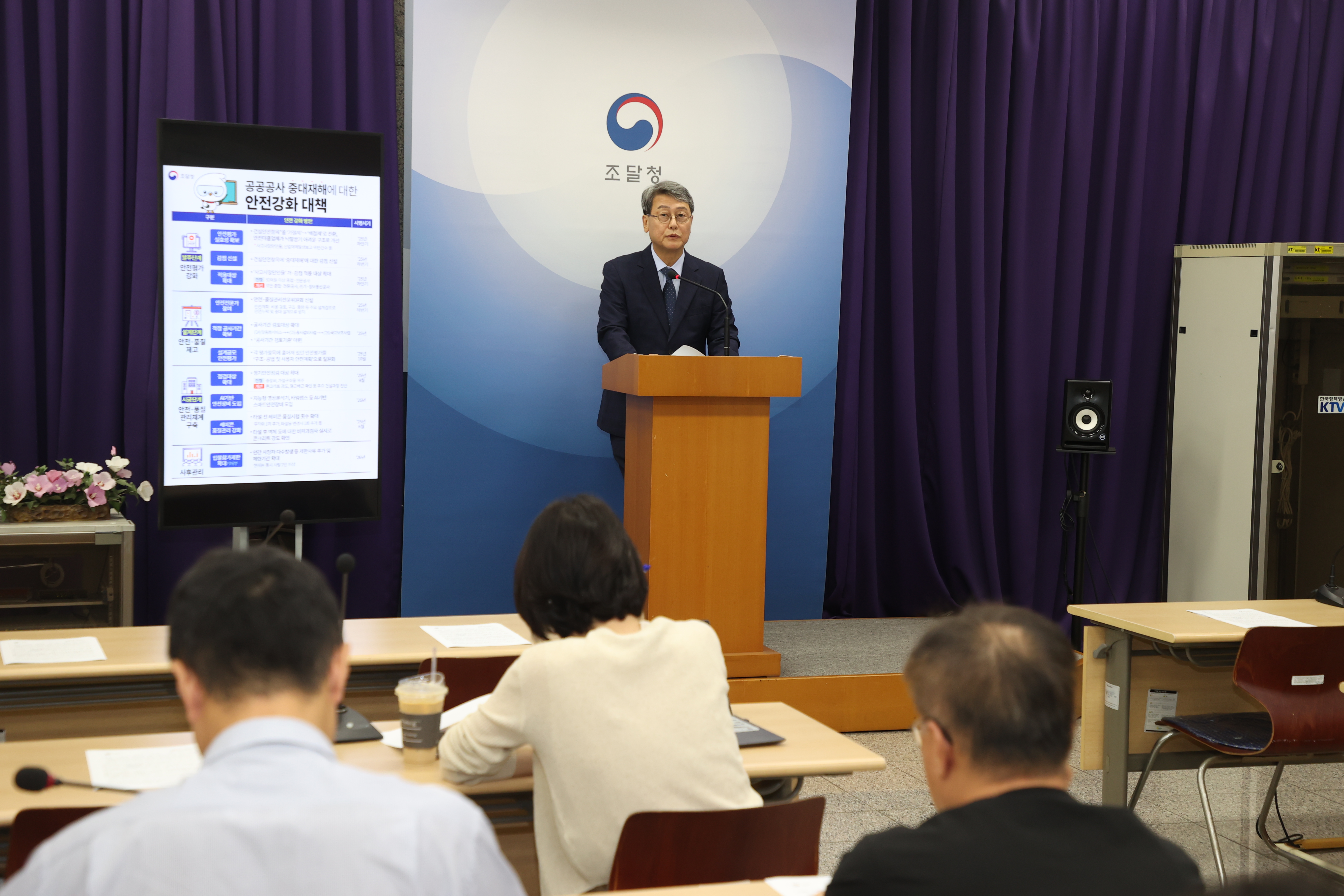 사진 : 권혁재 시설사업국장(단상)이 18일 정부대전청사 기자실에서 '건설현장 중대재해 감축을 위한 안전강화 대책'에 대하여 브리핑하고 있다.