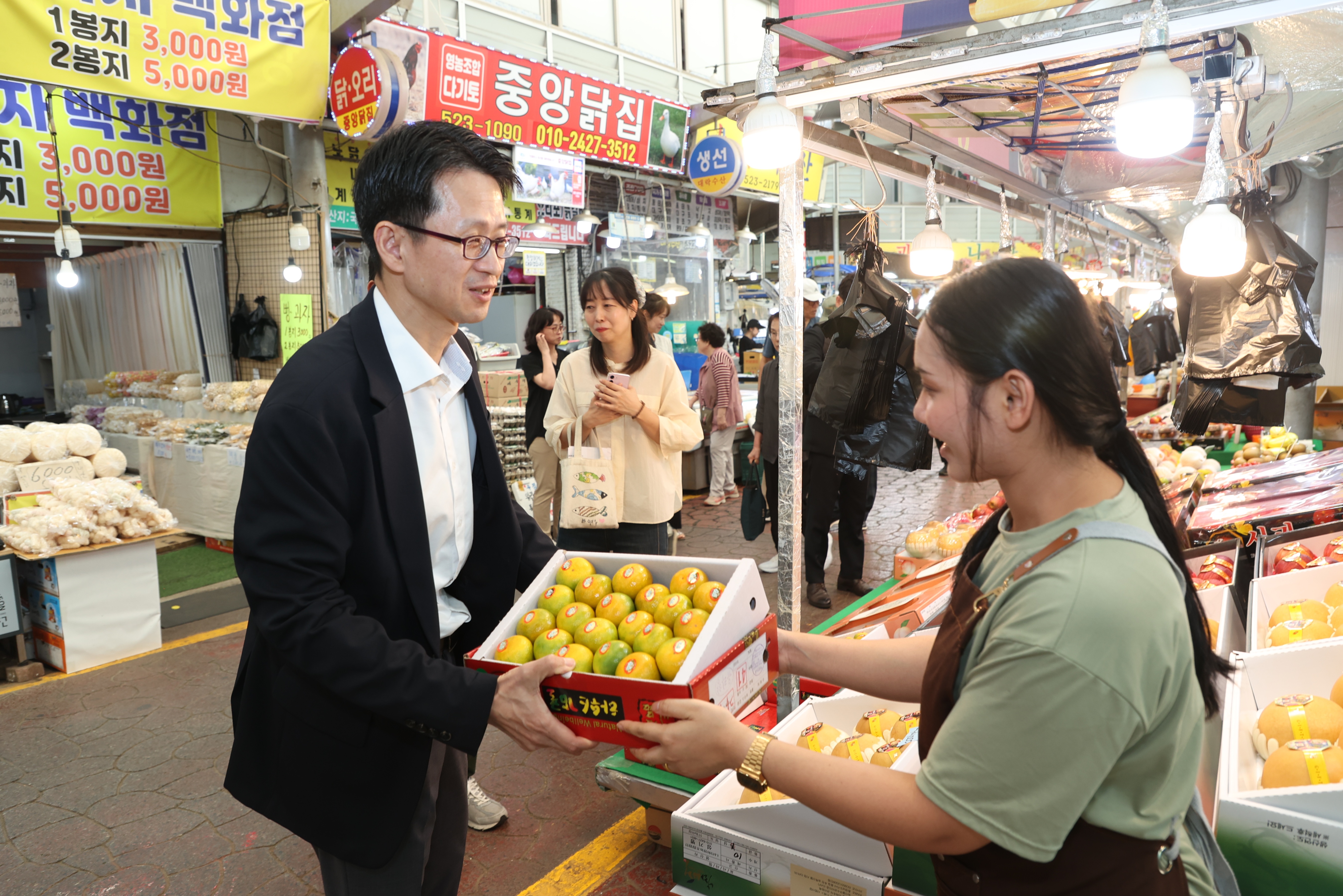사진 1 : 백승보 조달청장(왼쪽)은 26일 추석 명절을 맞아 대전 중구의 태평시장을 찾아 과일을 직접 구매하는 등 '지방살리기 상생소비' 행사를 추진했다.