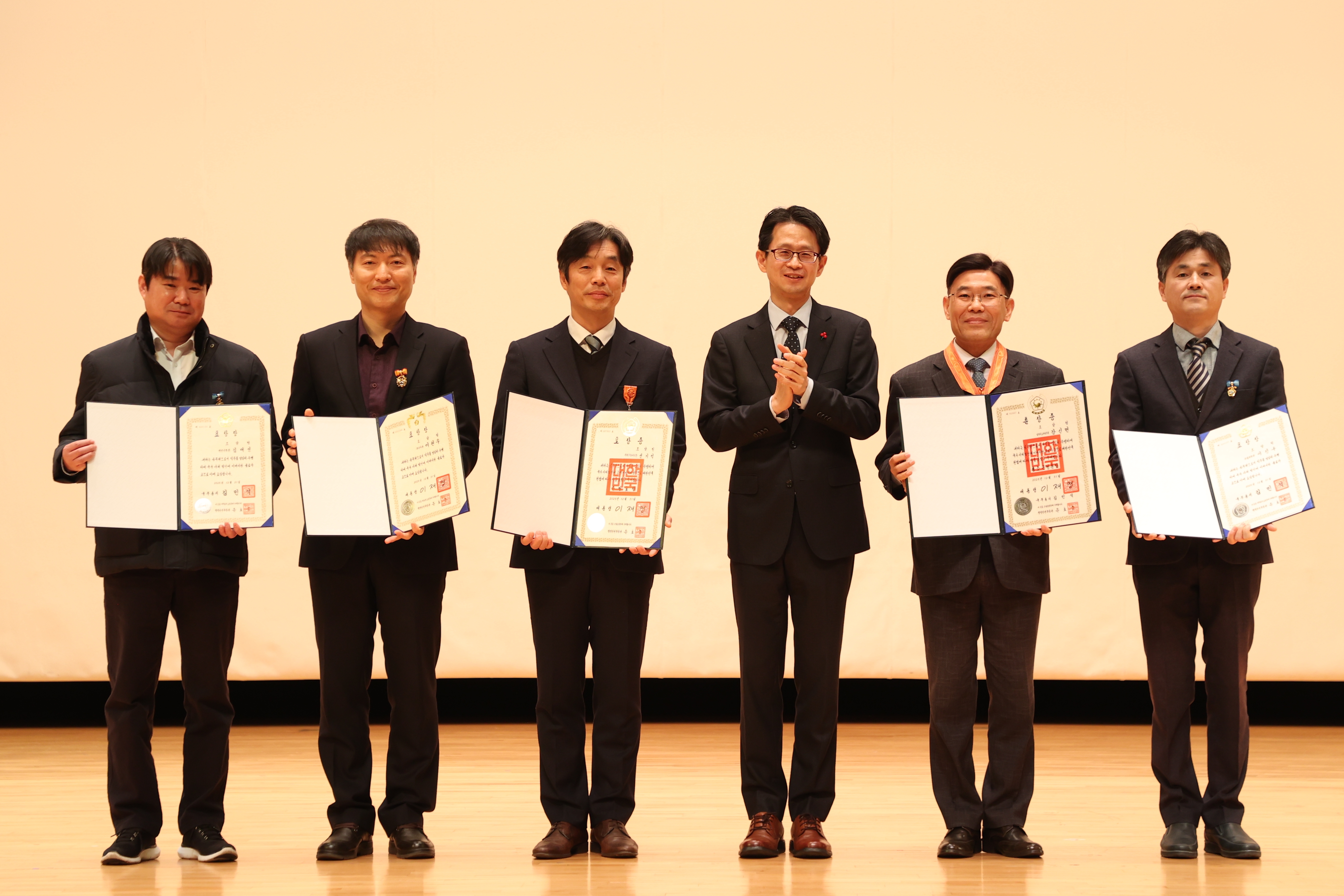 사진 3 : 백승보 조달청장(왼쪽에서 네번째)이 16일 조달청 개청 77주년 기념식에서 정부포상을 수상한 직원들과 기념촬영을 하고있다.